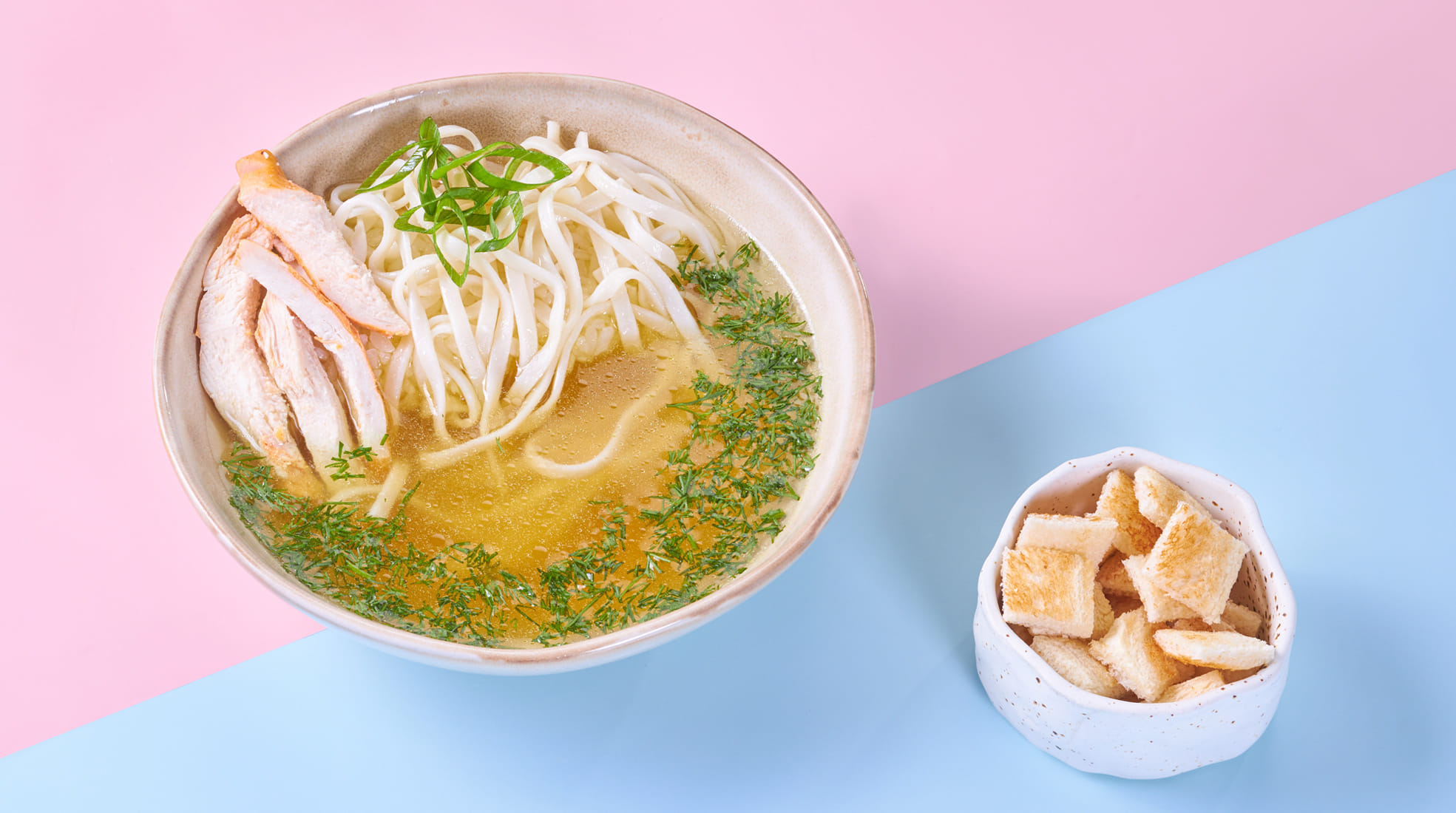 Бульон куриный, курица, укроп, лапша удон, сухари чесночные. *Внешний вид блюда может отличаться от фото на сайте.
