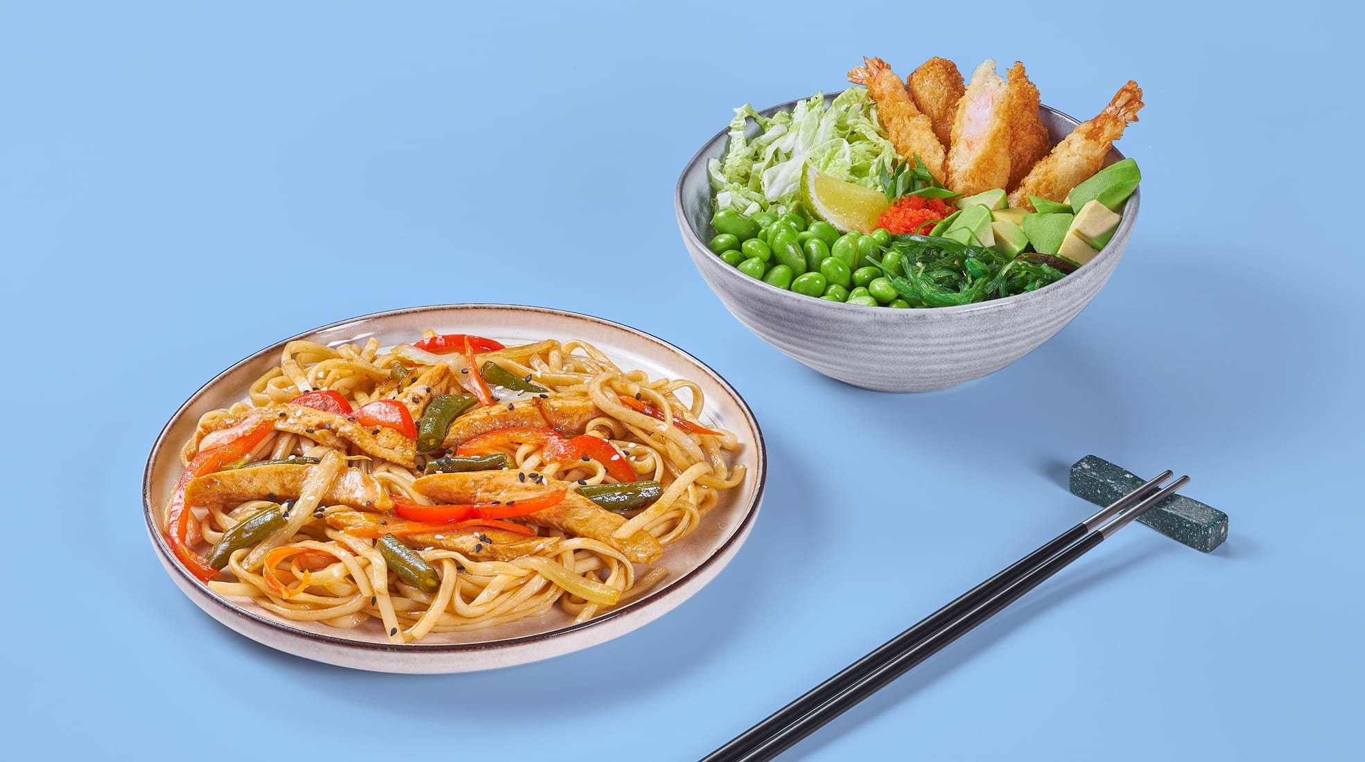 Вок с курицей терияки, Поке с креветкой панко. *Внешний вид блюда может отличаться от фото на сайте.