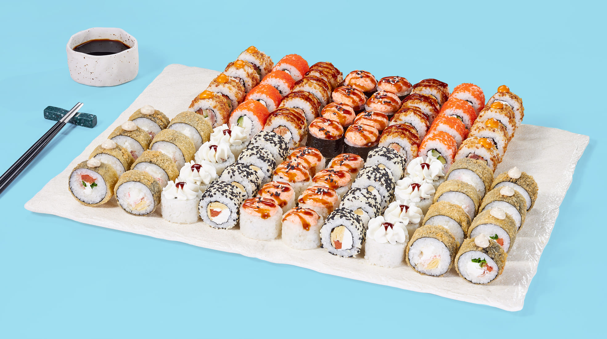 Ролл Филадельфия лайт (8 шт), ролл Калифорния супер лайт (8 шт), ролл Филадельфия в кунжуте (8 шт), ролл Бао (8 шт), ролл Спешл (8 шт), ролл Южный (8 шт), ролл Флай-скай (8 шт), ролл Нежный с курицей (8 шт), ролл Канада хот (8 шт). *Не забудьте заказать имбирь, васаби и соевый соус. Они не входят в стоимость заказа. *Внешний вид блюда может отличаться от фото на сайте.