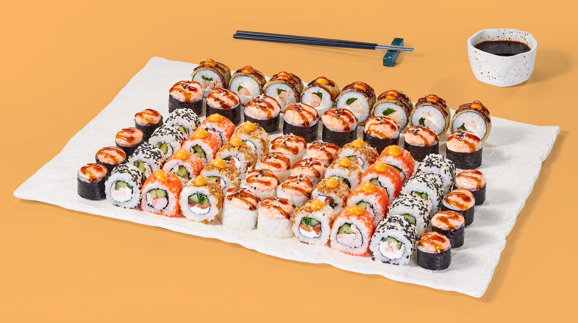 Ролл Лава краб (8 шт.), ролл Макото (8 шт.), Каппа маки ролл (мини) (8 шт.), Цезарь ролл (8 шт.), ролл Мураками (8 шт.), ролл Окамото (8 шт.), ролл Йоко (8 шт.) *Не забудьте заказать имбирь, васаби и соевый соус. Они не входят в стоимость заказа. *Внешний вид блюда может отличаться от фото на сайте.